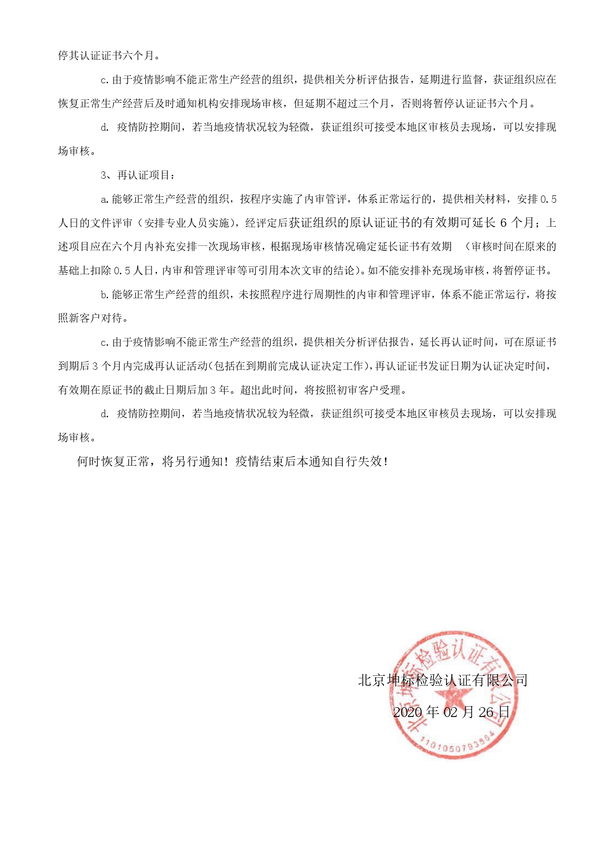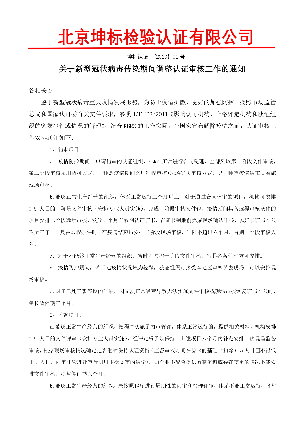 關(guān)于新型冠狀病毒傳染期間調(diào)整認(rèn)證審核工作的通知
