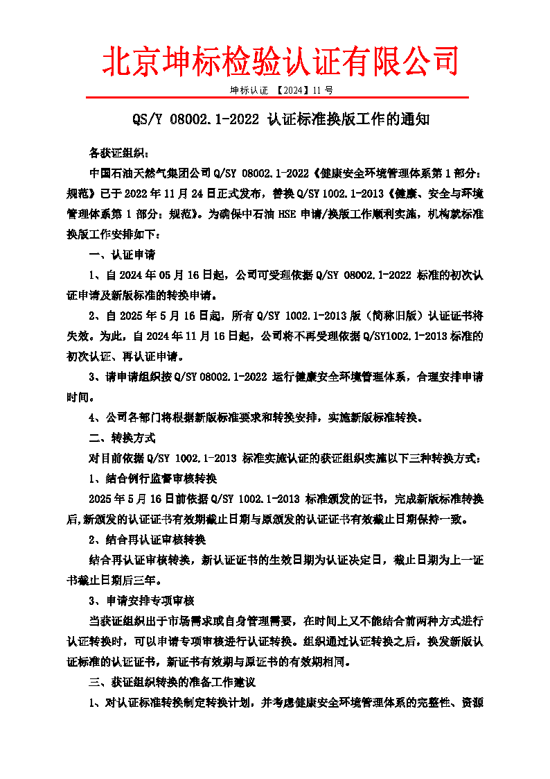 - QS/Y 08002. 1-2022認(rèn)證標(biāo)準(zhǔn)換版工作的通知 坤標(biāo)認(rèn)證[2024] 11號(hào)
